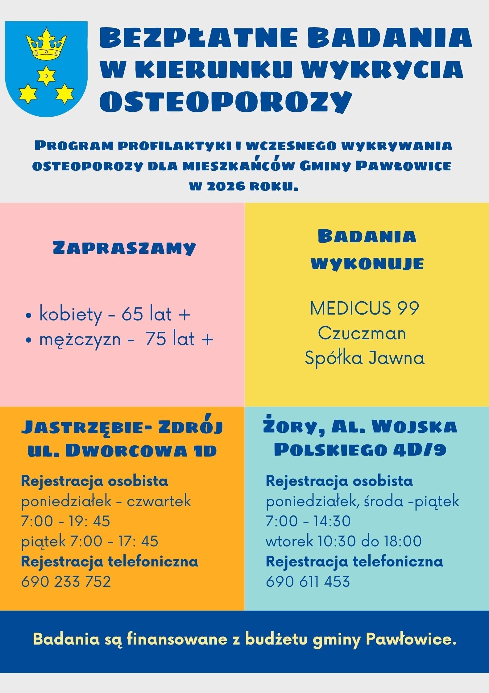 Gmina Pawłowice realizuje w 2026 roku program profilaktyczny ukierunkowany na wczesne wykrywanie osteoporozy. Inicjatywa ma na celu poprawę stanu zdrowia mieszkańców poprzez umożliwienie bezpłatnej diagnostyki oraz wykrycie choroby na wczesnym etapie – zanim pojawią się jej poważne skutki.