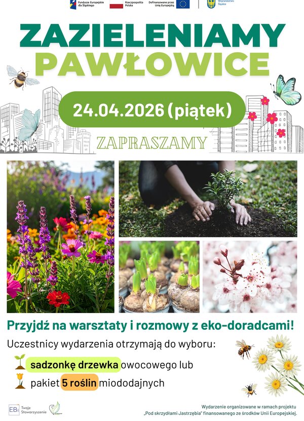 Już jutro 24 kwietnia 2026 r. zapraszamy mieszkańców gminy Pawłowice na zieloną akcję, która odbędzie się przed Urzędem Gminy w Pawłowicach. Celem wydarzenia jest promocja działań proekologicznych, wspieranie bioróżnorodności oraz tworzenie przyjaznych warunków dla zapylaczy, w tym pszczół.