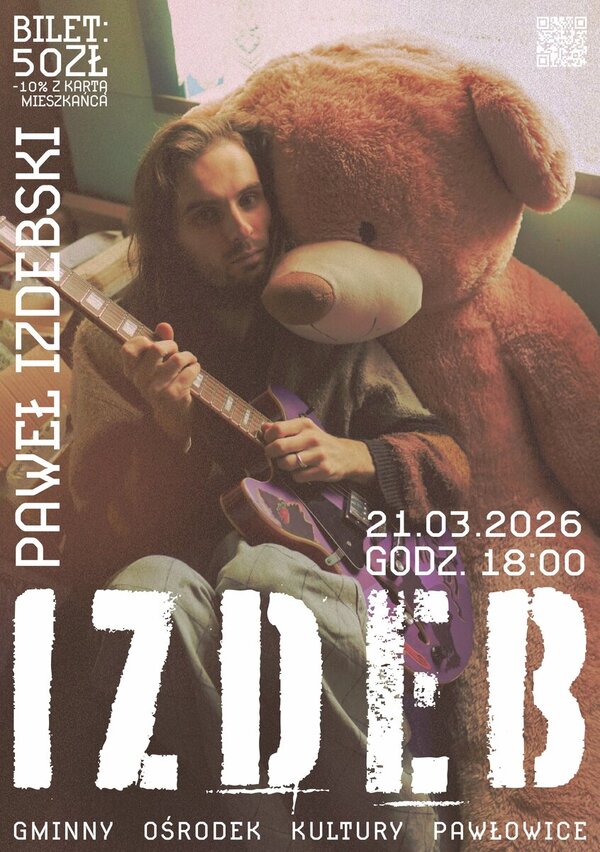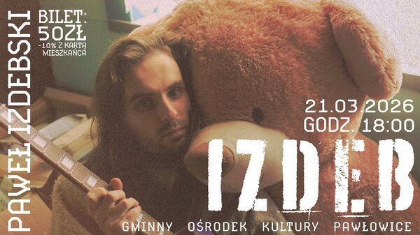 Gminny Ośrodek Kultury w Pawłowicach zaprasza na koncet. Izdeb to chłopak z gitarą, który czasami zagra także na pianinie, harmonijce, a nawet wsunie tamburyn w skarpetę. Po 20 latach muzycznej tułaczki nadal pisze i występuje ze swoim solowym aktem, na którym porusza ważne dla siebie tematy, starając się za wszelką cenę uniknąć stand-upowych aspiracji.