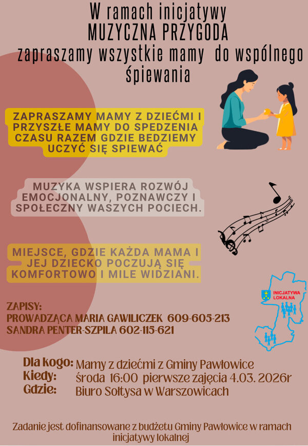 W ramach inicjatywy „Muzyczna Przygoda” zapraszamy mamy z dziećmi oraz przyszłe mamy z terenu Gminy Pawłowice do udziału we wspólnych zajęciach muzycznych.