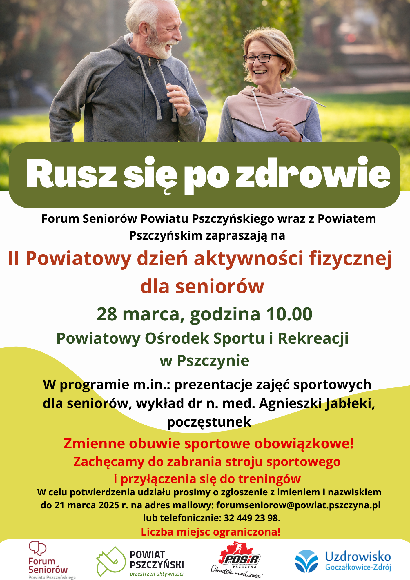 Należy zabrać stroj i obuwie sportowe – w planie przewidziane są aktywności ruchowe! Zapisy trwają do 21 marca – liczba miejsc ograniczona. Zgłoszenia przyjmowane są na adres mailowy: forumseniorow@powiat.pszczyna.pl lub telefonicznie 32 449 23 98. Zapraszamy wszystkich seniorów, którzy chcą zadbać o swoją formę, zdrowie i dobre samopoczucie.