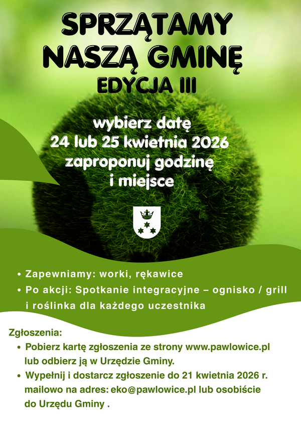 Akcja odbędzie się w dniach 24 i 25 kwietnia 2026 r. Uczestnicy wybierają dogodny termin podczas zgłoszenia. Sprzątamy ogólnodostępne tereny publiczne – ulice, skwery, place oraz tereny zielone w sołectwach Gminy Pawłowice.