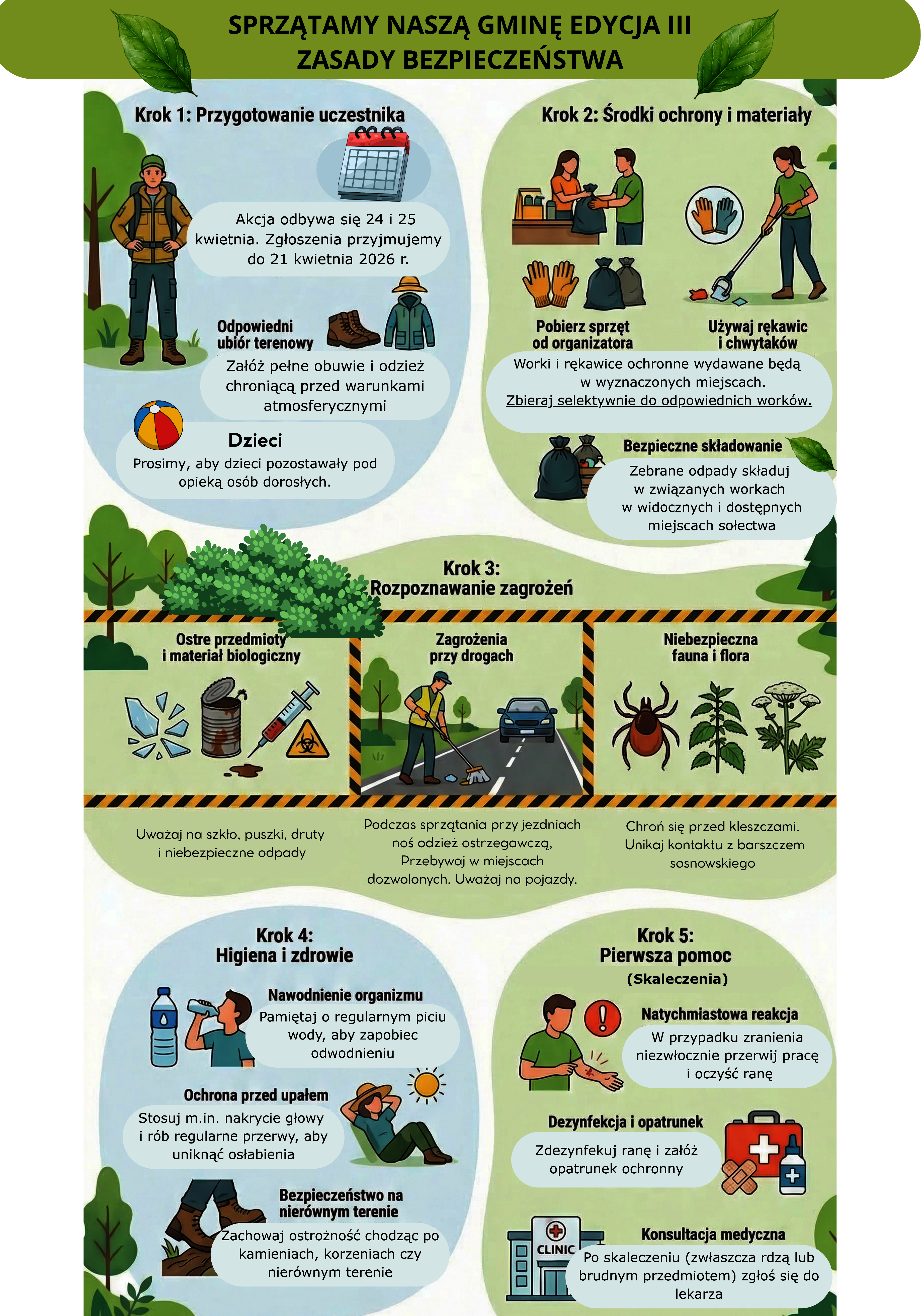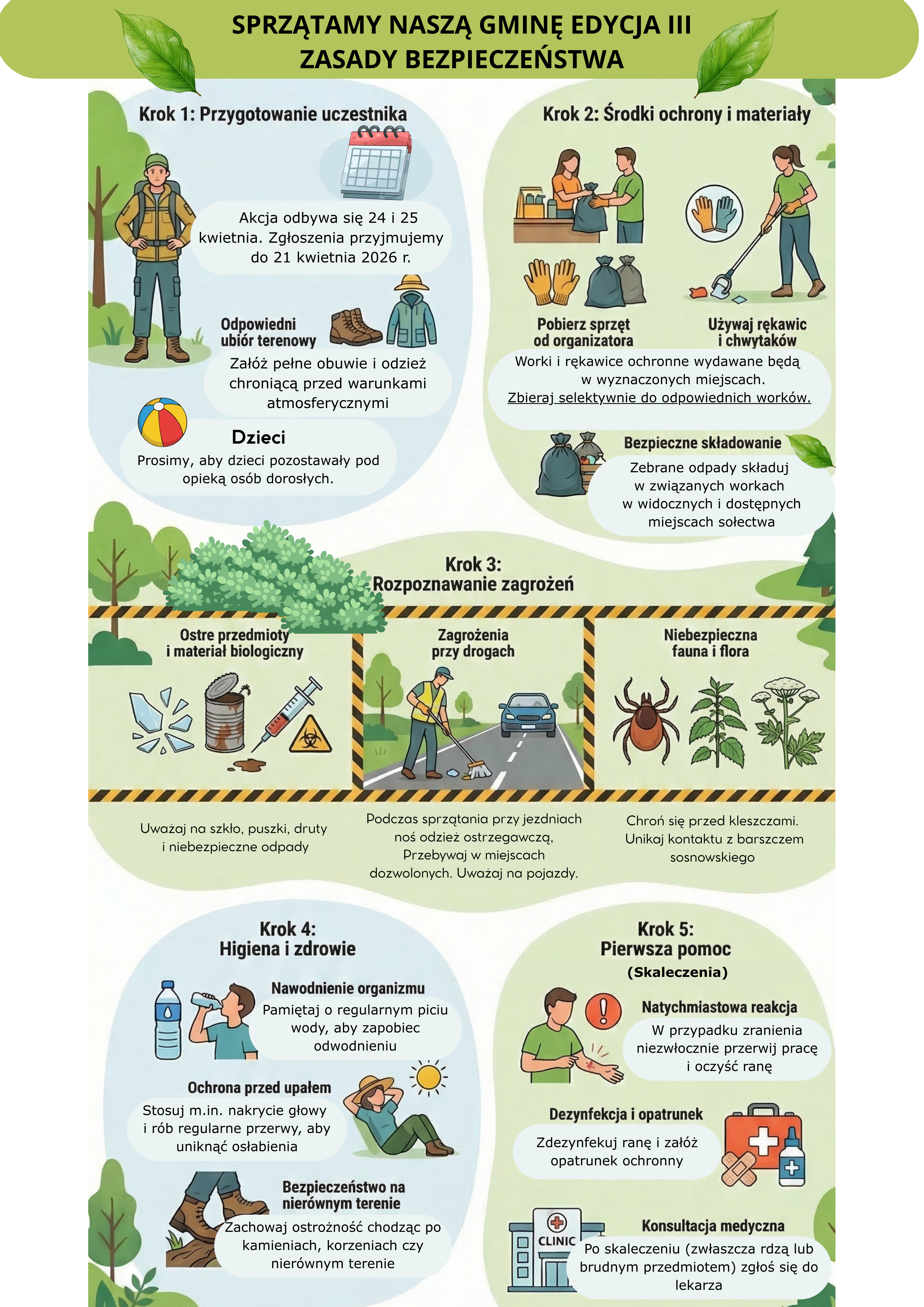 Zapraszamy mieszkańców do udziału w trzeciej edycji akcji „Sprzątamy naszą gminę”. W akcji może wziąć udział każdy mieszkaniec gminy – zarówno indywidualnie, jak i w zorganizowanych grupach. Zachęcamy szczególnie do tworzenia drużyn sąsiedzkich, rodzinnych i przyjacielskich, a także do udziału:
